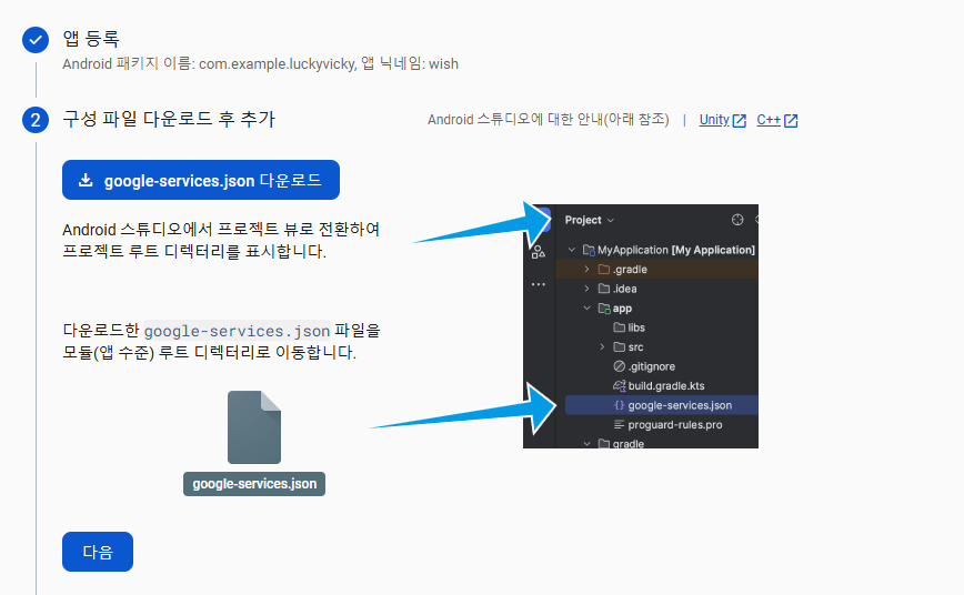 여기서 주어지는 goggle-service.json 파일은 안드로이드스튜디오에 사진과 같이 넣어줘야 한다!
