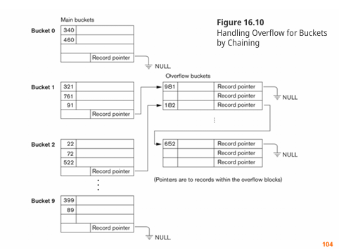 그런데, External Hashing에서도 역시나 서로 다른 키가 동일한 해시 값을 갖는 충돌(collision)이 빈번히 발생할 수 있다. 이를 효율적으로 관리하기 위해 오버플로우 체인(Overflow Chain) 또는 버킷 구조를 사용하여 충돌을 효율적으로 관리한다.