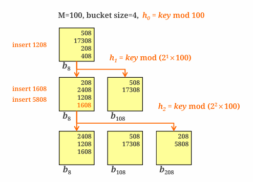 : 위의 Extendible Hashing과 유사한데, Directory를 Tree로 유지하는 방식이다. 필요에 따라 Tree의 Depth를 변경하면서 Bucket의 수를 조정할 수 있다.