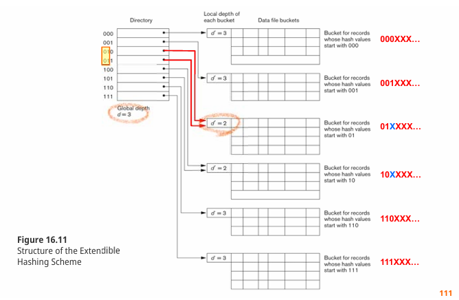 이처럼 버킷 분할로 인해 디렉토리에서 doubling 혹은 havling이 발생하는데, 이는 reorganization에 비해 성능에 영향을 주지 않는다. 다만, 모든 상황에서 hashing -> directory table -> bucket 순서로 2번 검색을 해야한다.
