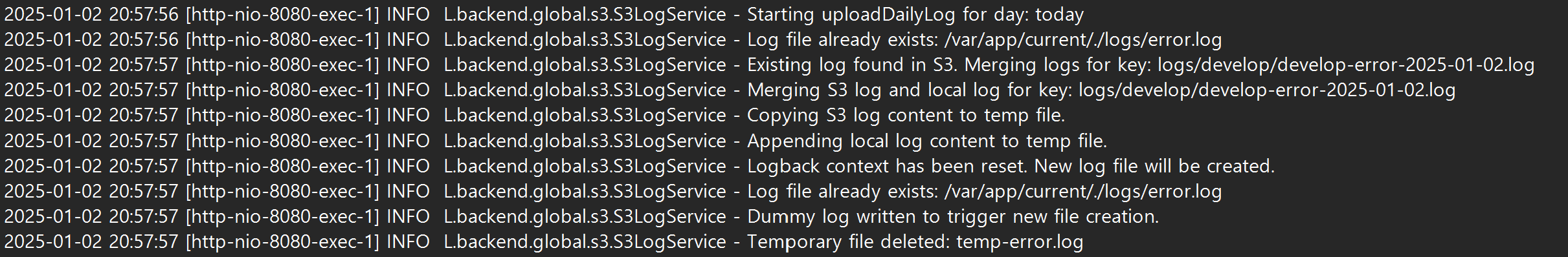 S3로 로그 파일을 업로드한 후, 로컬 로그 파일을 삭제하고 새 파일을 생성하는 과정에서 문제가 발생했다. logback-spring.xml에 설정된 RollingFileAppender가 로그 파일이 없을 때 자동으로 새 파일을 생성해야 하지만, 기존 컨텍스트가 파일 핸들러를 유지하고 있어 파일이 생성되지 않는 문제가 있었다. 이를 해결하기 위해 Logback 컨텍스트 재설정 로직을 추가했다.