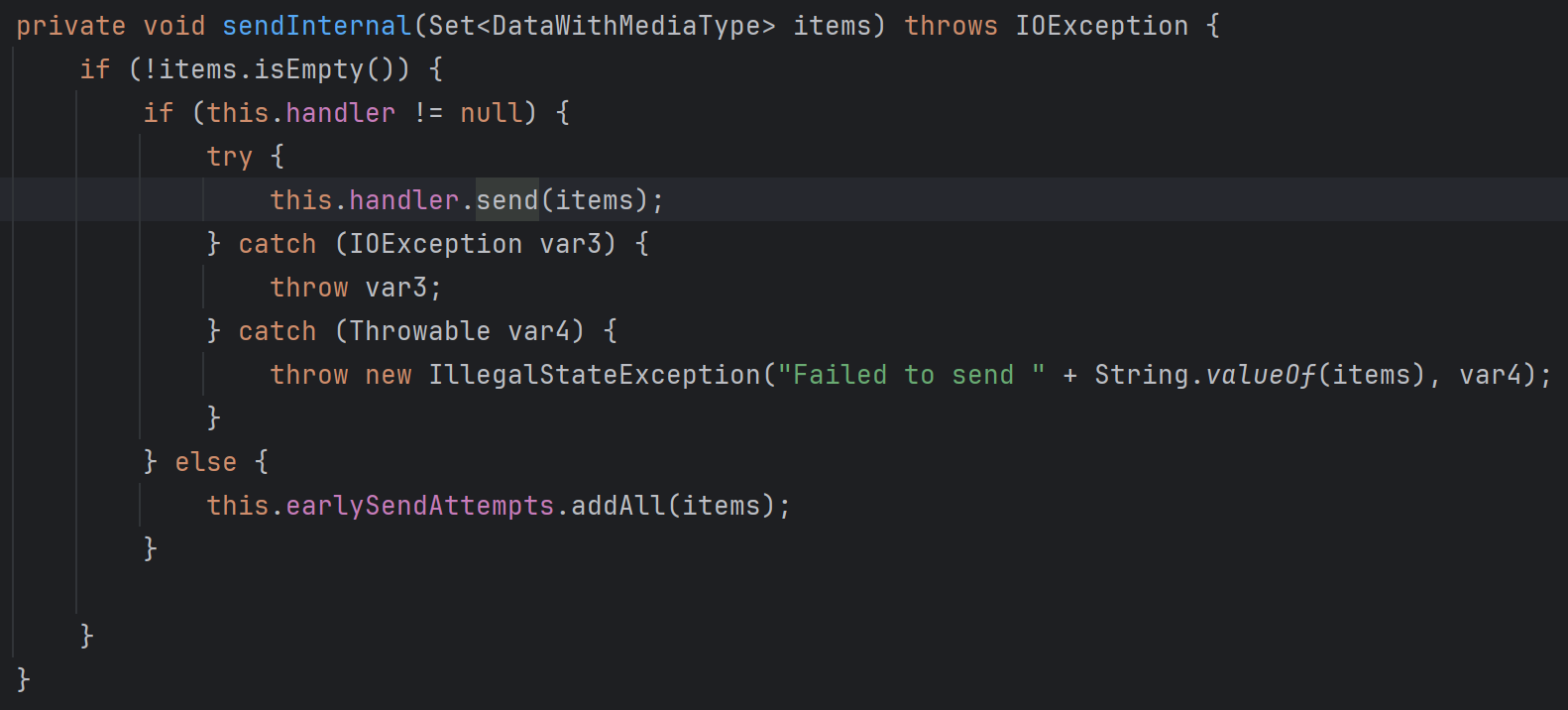 while을 돌면서 SseEventBuilder로 만든 데이터 조각들을 하나씩 꺼내서 sendInternal로 넘긴다. 그리고 마지막에 flush()를 호출함으로써 데이터를 버퍼에 쌓아두지 말고 즉시 클라이언트에게 쏘게 된다.
