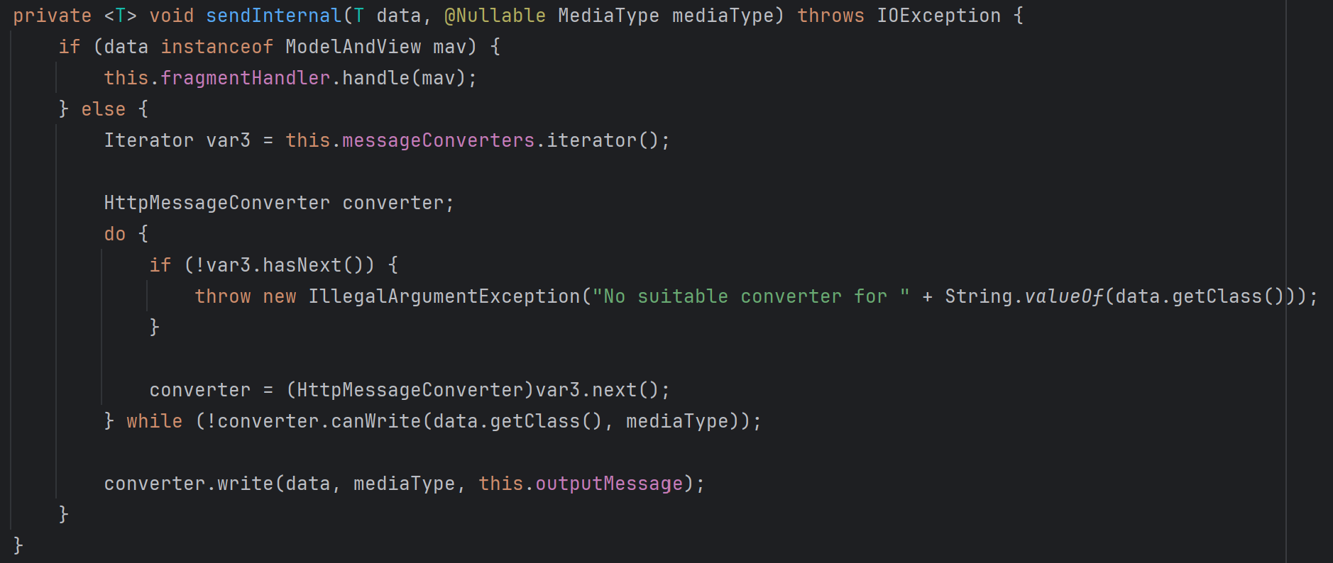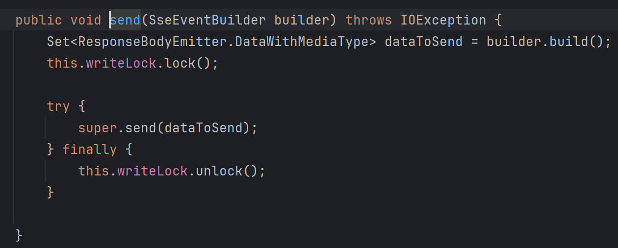 결국 SseEmitter가 상속하고 있는 상위 클래스인 ResponseBodyEmitter를 통해 메시지가 전송이 된다. 여러 스레드가 동시에 send()를 호출할 때, 데이터가 서로 뒤섞이지 않도록 한 번에 한 메시지만 보내도록 동기화(synchronized)하고 있음을 확인할 수 있다.