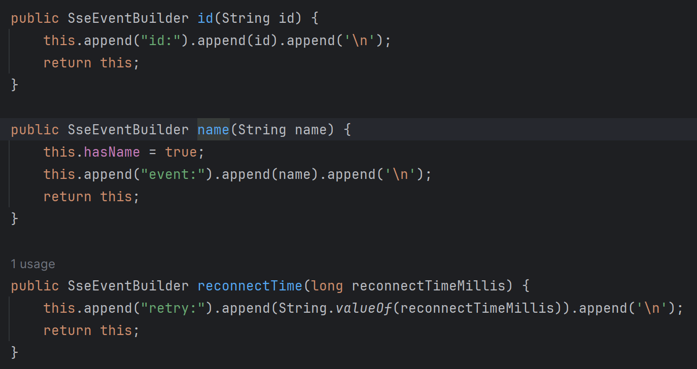 예를 들어 위와 같은 코드로 메시지를 만들고, 전송할 수 있다. SseEmitter class의 정적 메서드(event)를 통해 SseEventBuilderImpl 객체를 만들고, name(), data(), id() 등의 메서드를 통해 이벤트의 데이터를 넣게 된다.