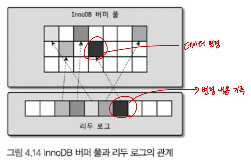 로그 버퍼와 버퍼 풀의 언두 페이지는 Redo 로그를 버퍼링할 수 있는 자료구조다.