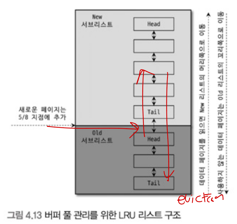 버퍼 풀에 상주하는 데이터 페이지는 사용자가 얼마나 최근에 접근했었는지에 따라 나이가 부여되고, MRU와 LRU를 이동한다.