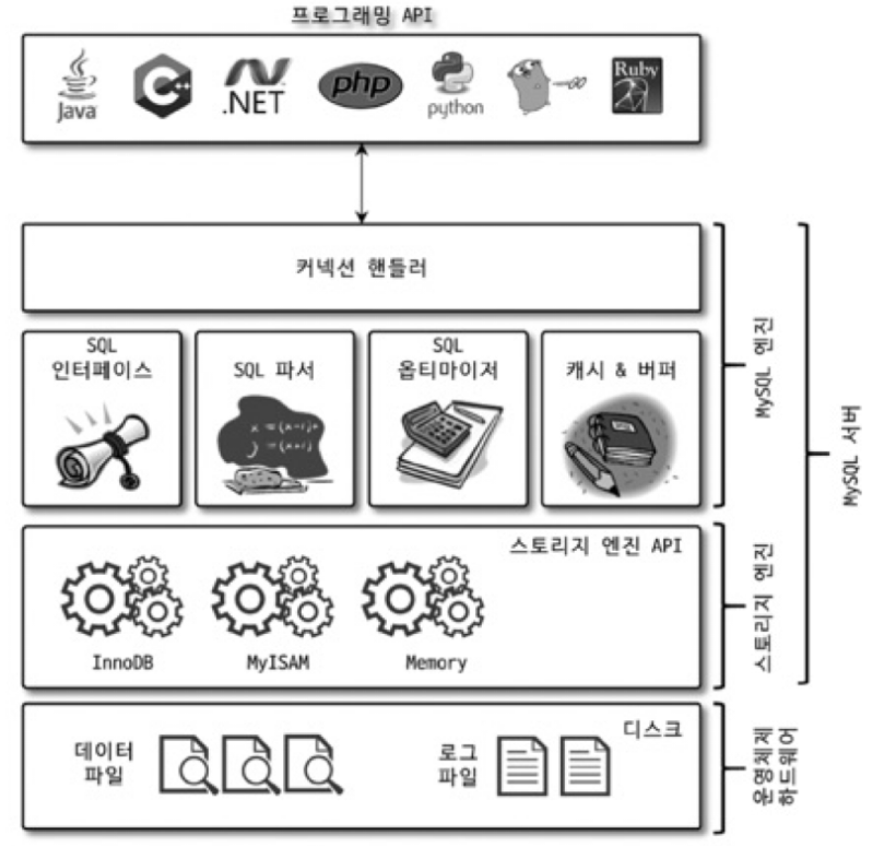 프로그램은 커넥션 핸들러를 통해 DB와 연결된다. 프로그램이 SQL을 전송하면, MySQL 엔진이 파싱(분석)하고, 전처리 후, 옵티마이즈(최적화), 실행기로 전송한다. 최종적으로 핸들러를 통해 스토리지 엔진이 요청을 수행하게 된다.