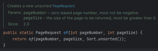 Spring Data JPA에서 사용되는 PageImpl 클래스의 생성자를 호출하여 Page 객체를 생성하여 리턴하는 모습을 볼 수 있다. pageable은 현재 페이지와 한 페이지에 들어갈 데이터 개수를 이용해 PageRequest를 통해 만들었다.