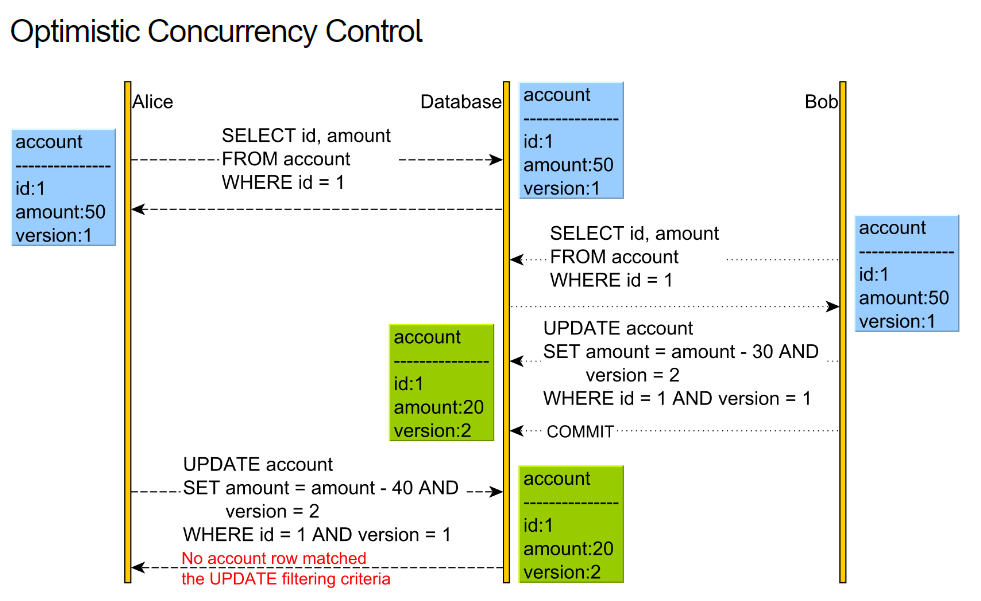 - 트랜잭션이 데이터를 수정하기 전에 다른 트랜잭션이 데이터를 변경했는지 확인하는데, 이때 주로 버전 번호나 타임스탬프를 사용한다.