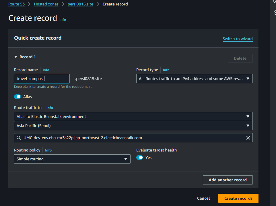 Route 53에서 추가해놓은 도메인에 들어가서 record를 다음과 같이 해주면 된다.