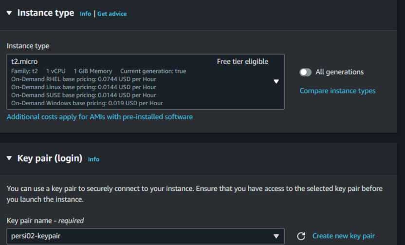 용량 큰거 필요 없으니 t2.micro 골라주고, key pair 기입하자.