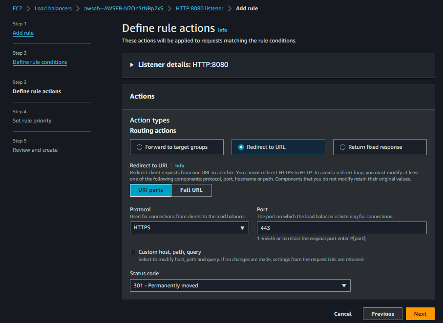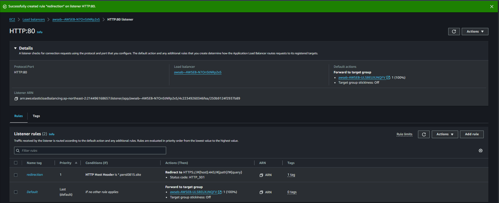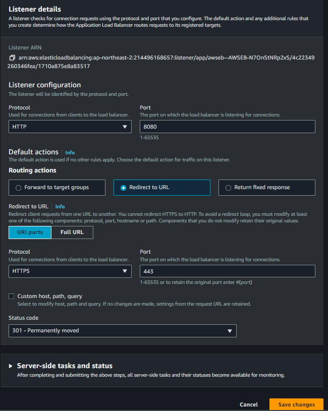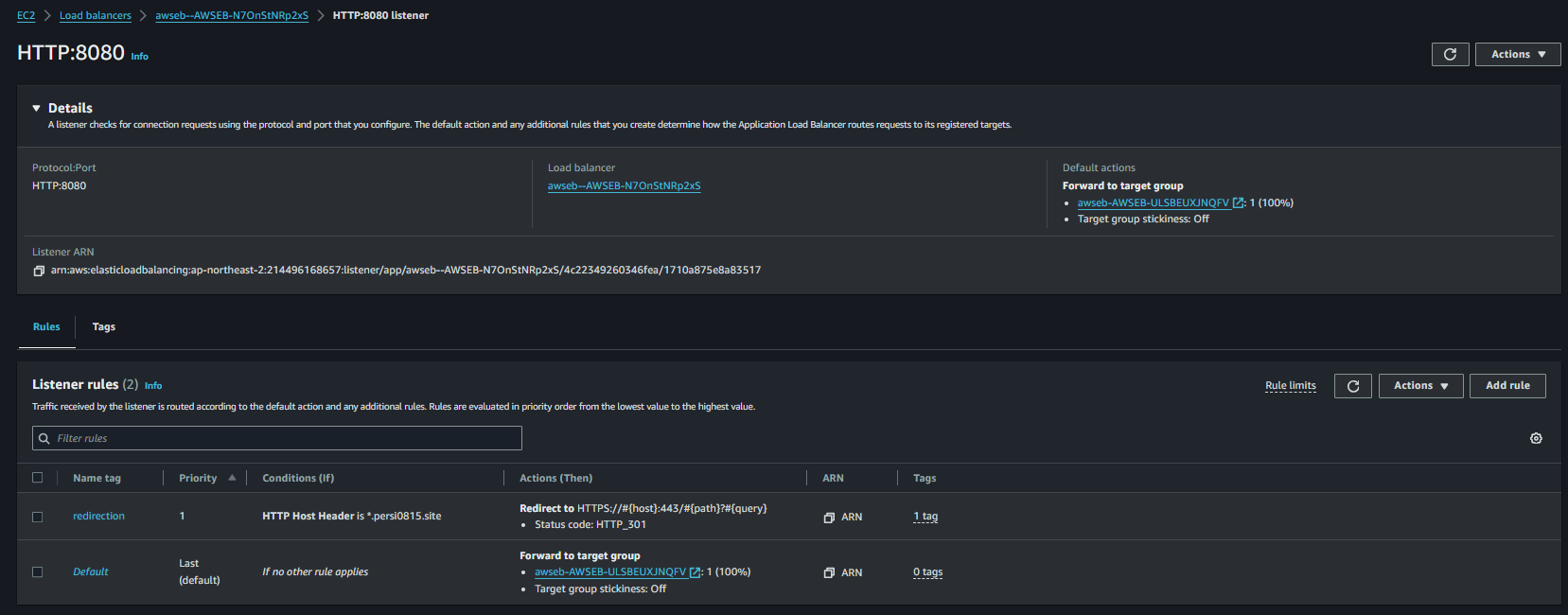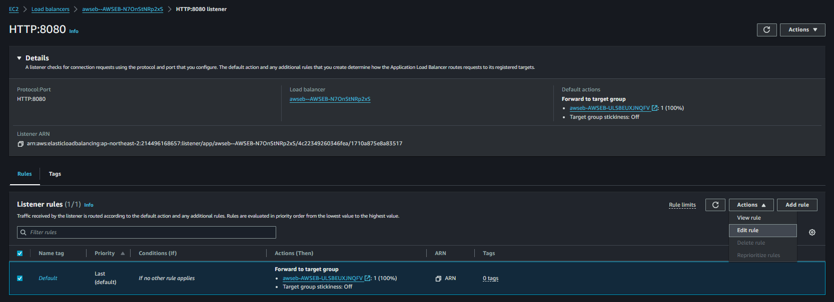 edit을 하면 rule을 수정할 수도 있는데, 나는 타깃 그룹으로 라우팅 되어있는 설정에 https로 리다이렉트하는 리스너 룰을 추가해주었다.