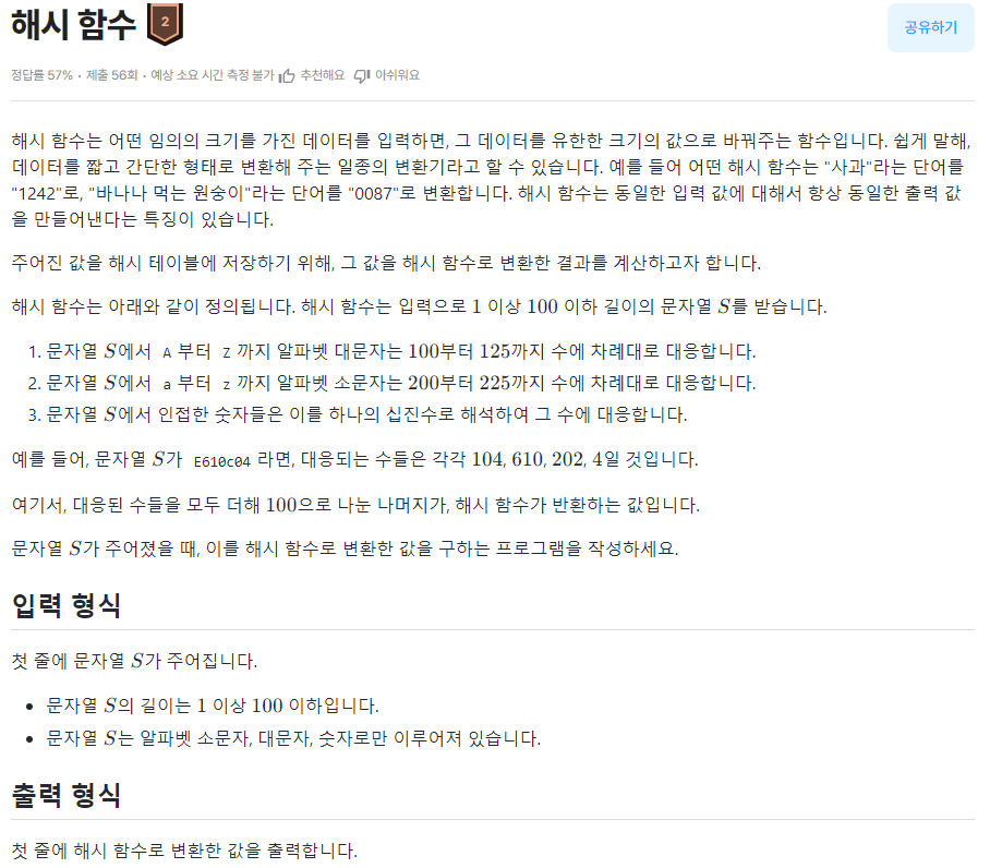 해시 함수에 문자열 입력값을 넣어서 특정한 값으로 추출하는 해싱 그 자체인 문제였다.
